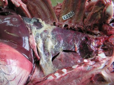 Thể cấp tính, bệnh tích phổi rõ nhất là màng phổi viêm, ứa dịch và sợi huyết đồng thời dính chặt với xoang ngực. Phổi mờ đục, bề mặt cắt xù xì. Phổi xuất huyết hoại tử có fibrin.