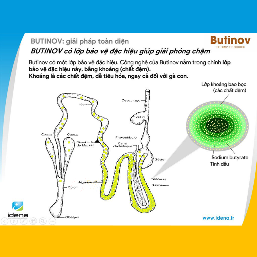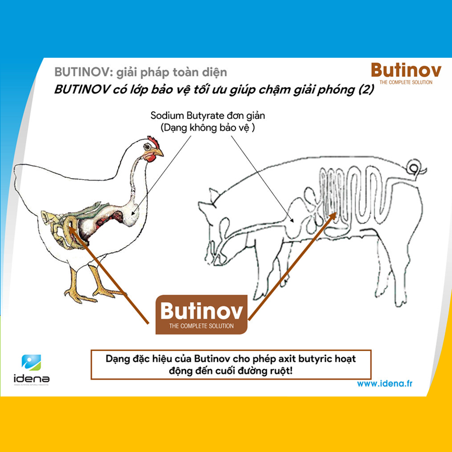 Với bản chất được bọc bởi khoáng, lớp khoáng không bị ảnh hưởng bởi nhiệt độ ép viên (85°C) hoặc ép viên (110°C), đảm bảo vẫn đủ lượng acid có trong thức ăn thành phẩm trong khi acid bọc béo bị ảnh hưởng bởi nhiệt độ qua quá trình ép viên do điểm nóng chảy của chất béo là từ 60 đến 65°C. Được bảo vệ bởi lớp khoáng đặc hiệu cho phép Butinov đưa acid butyric đi sâu hơn vào hệ thống tiêu hóa mà không bị phân li hoàn toàn ở đoạn đầu ruột non.Giúp giải phóng chậm acid trong toàn bộ đường ruột, đồng thời giải phóng nguồn năng lượng hiệu quả và thích hợp cho ruột.