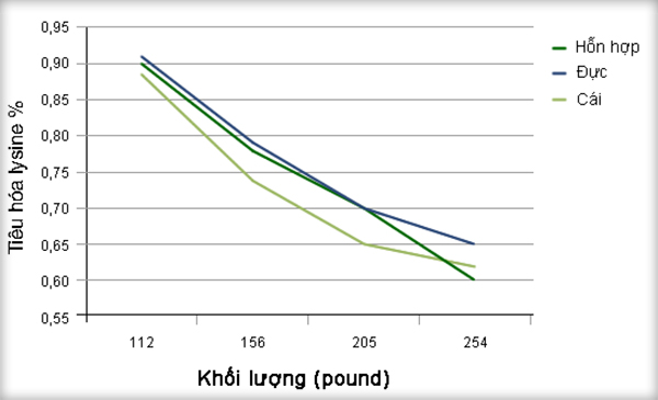 Hình 3: Nhu cầu lysine theo từng giai đoạn phát triển của heo so với mức lysine trong một khẩu phần ăn bình thường