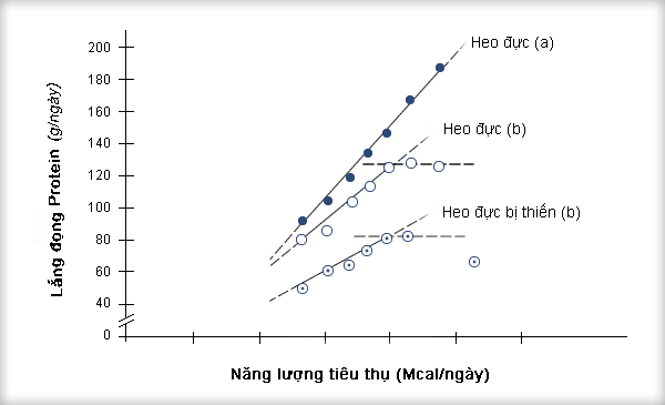 Hình 2: Mối quan hệ giữa việc tiêu thụ năng lượng và lắng đọng protein trên heo đực và heo đực thiến từ 45-90 kg (theo Campbell và các cộng sự, 1988)