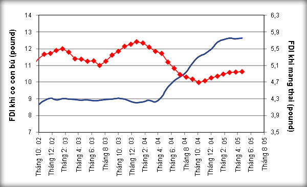 Hình 4: lượng thức ăn chăn nuôi thu nhận trong 6 tháng thời kỳ mang thai và cho con bú của heo nái (Nguồn: Swine day, 2005).