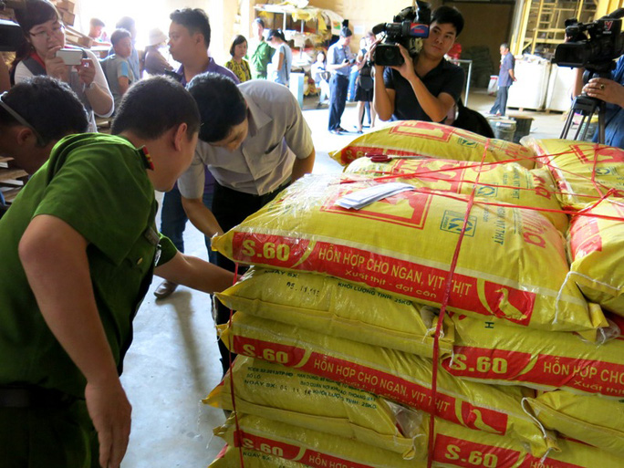 Lực lượng chức năng phát hiện doanh nghiệp sản xuất thức ăn chăn nuôi tại tỉnh Hải Dương sử dụng chất cấm. Ảnh: MINH LONG