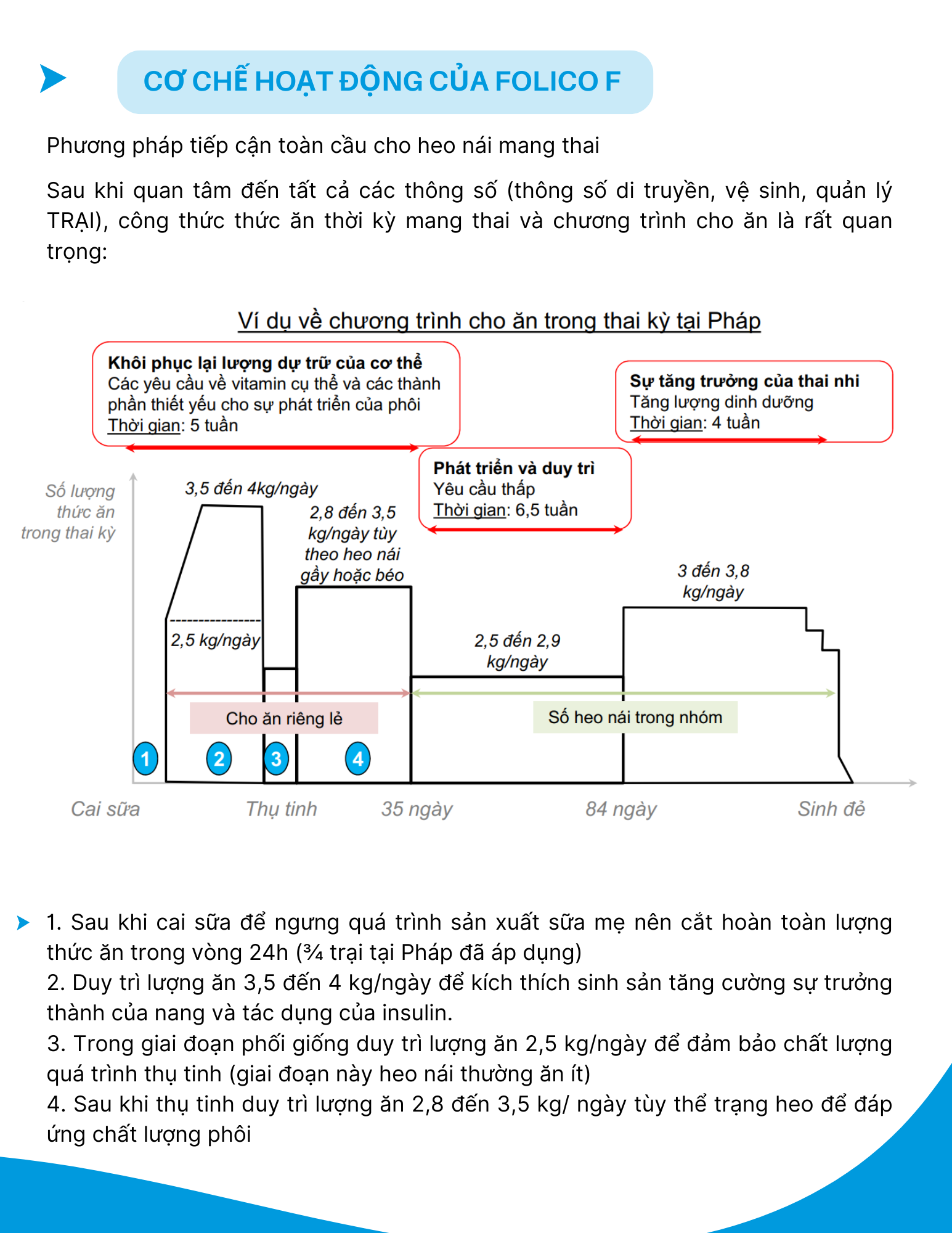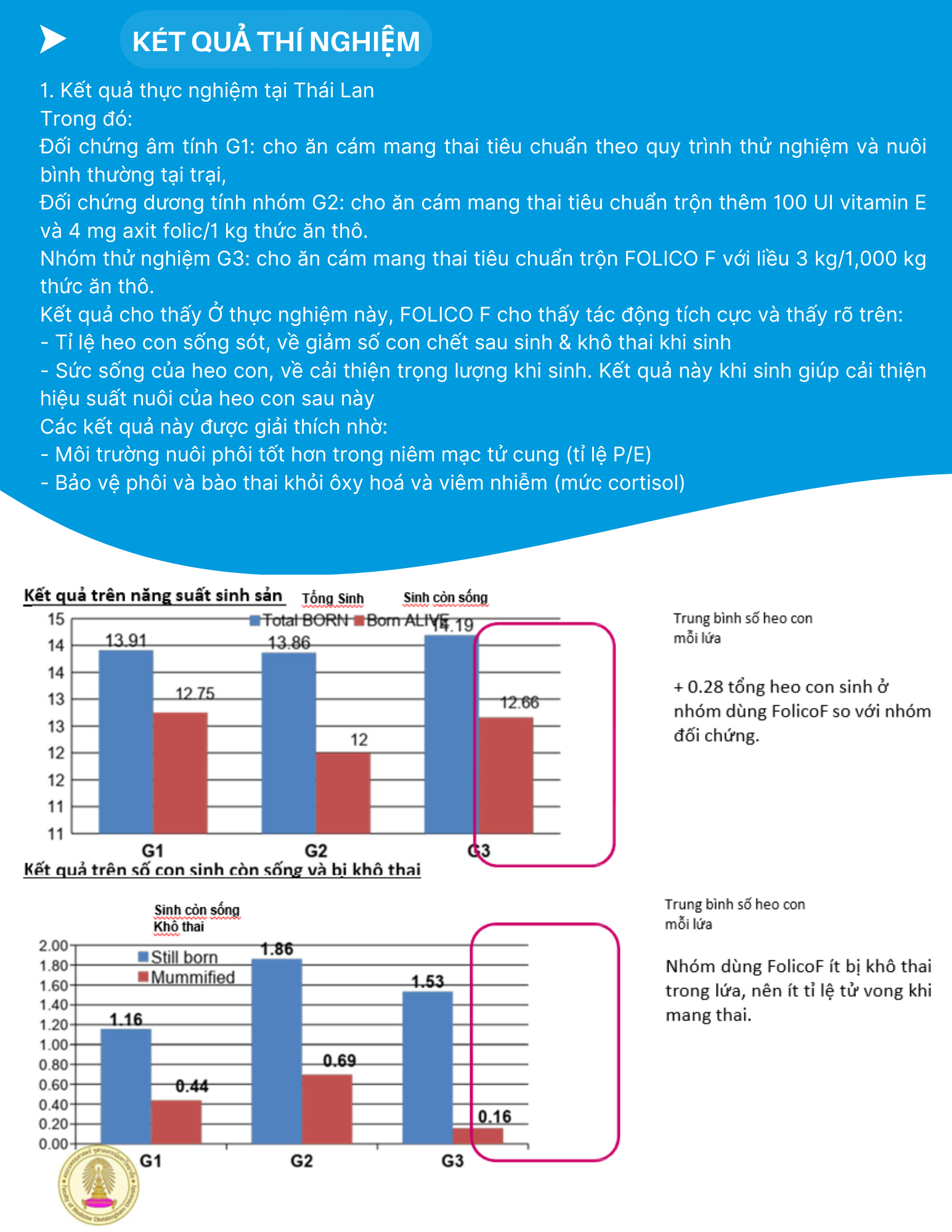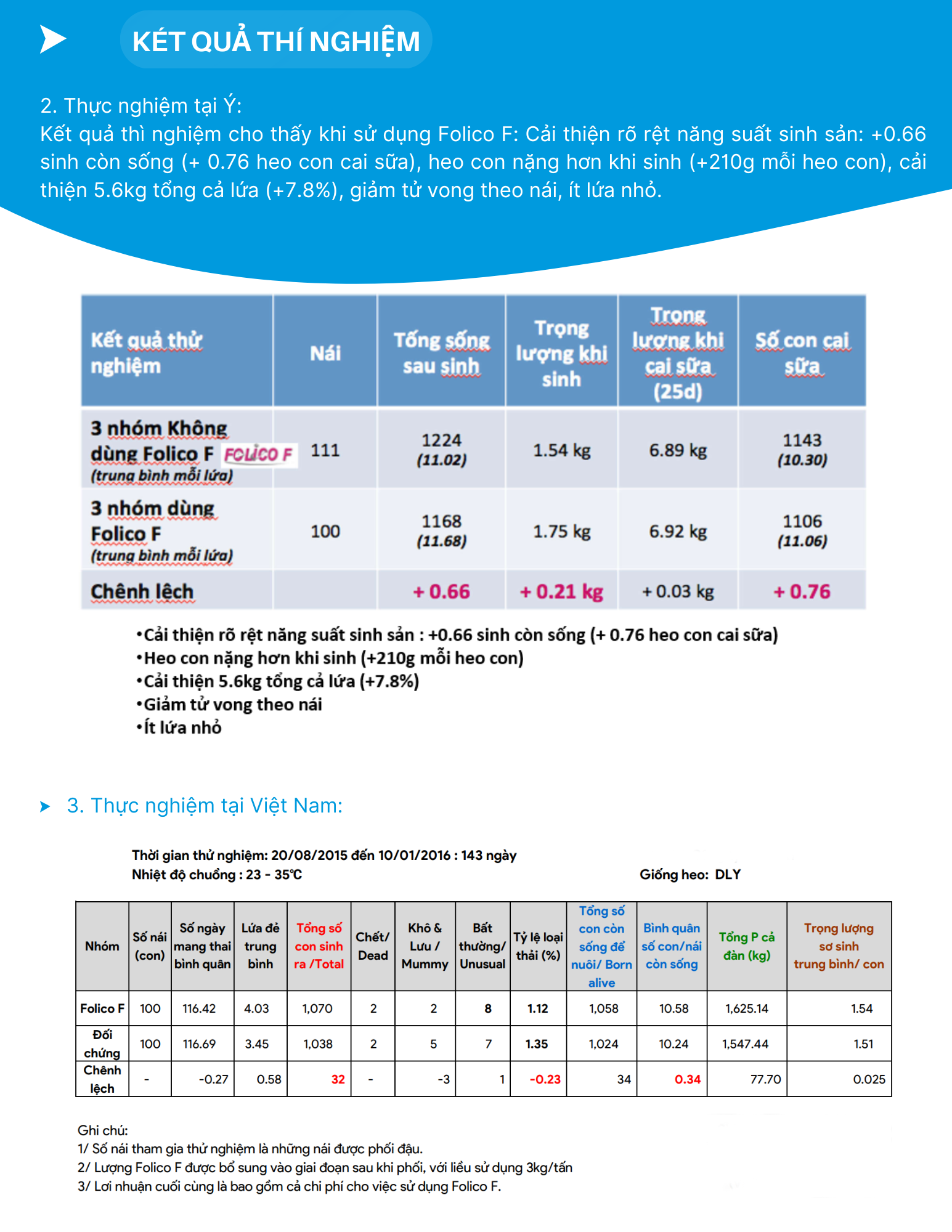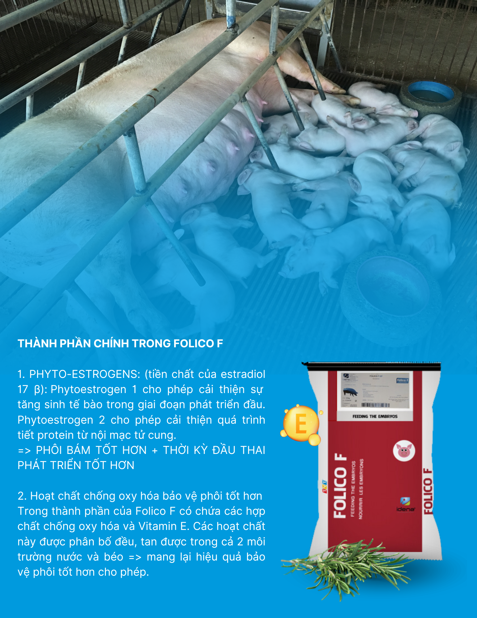 Folico F: Tạo ra nhiều nang trứng trưởng thành hơn tại thời kỳ rụng trứng, Cải thiện việc cấy phối ngay sau khi thụ tinh và Tăng tính an thai tới khi đẻ. Ngoài ra Folico F còn tác động trực tiếp đến khả năng Sinh được nhiều heo con hơn, nặng hơn, đàn đồng nhất và từ đó cải thiện hiệu quả kỳ cai sữa.