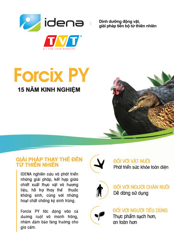 Là kết quả Nghiên cứu & Phát triển của IDENA từ năm 2004, FORCIX PY là sản phẩm tự nhiên chuyên biệt giúp tăng đề kháng đường ruột chống lại các rủi ro do sự hiện diện của cầu trùng. Hiệu quả của sản phẩm đã được đánh giá trong nhiều thử nghiệm. Trong các thử nghiệm đối chứng âm tính và dương tính, kết quả tích cực thu được cho thấy vẫn giữ được hiệu suất nuôi mà không dùng thuốc chống cầu trùng gốc ionophore hoặc dạng tổng hợp trong thức ăn.