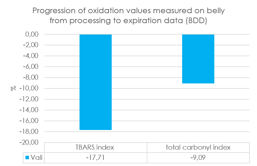 Hình 4: Kết quả đo lường oxy hóa lipid và protein trên phần bụng tại thời điểm chất lượng thực phẩm tốt nhất (BBD) (2019)