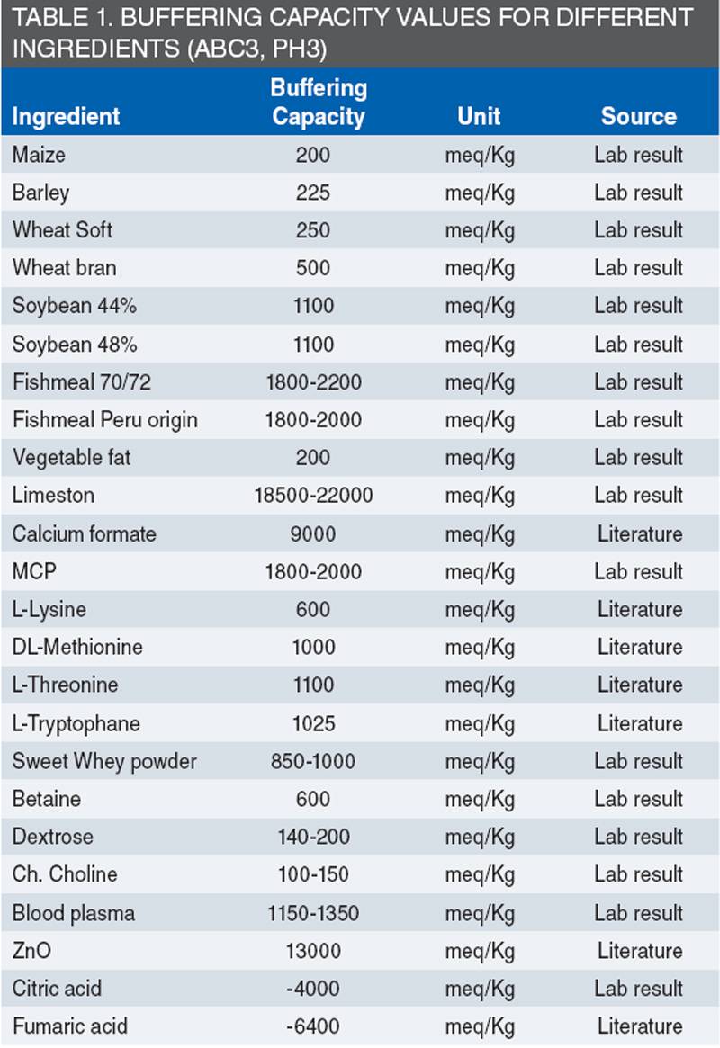 Chuyển qua phần thực tế hơn về xây dựng công thức thức ăn, giá trị đệm của thức ăn thành phẩm phụ thuộc rất nhiều vào các nguồn khoáng và protein, trong khi các loại ngũ cốc và các loại phụ phẩm thường có giá trị đệm thấp nhất (xem bảng 1).