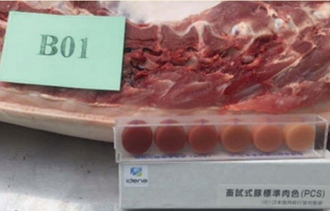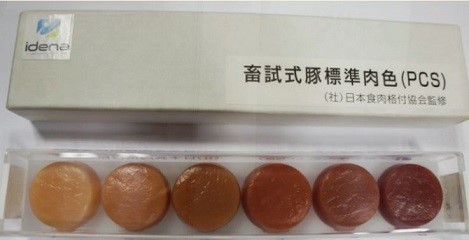 Màu thịt mong muốn khi dùng RED’MEAT như phụ gia trong thức ăn ở tháng 4 và 5 trên thang màu Nhật Bản bên cạnh.