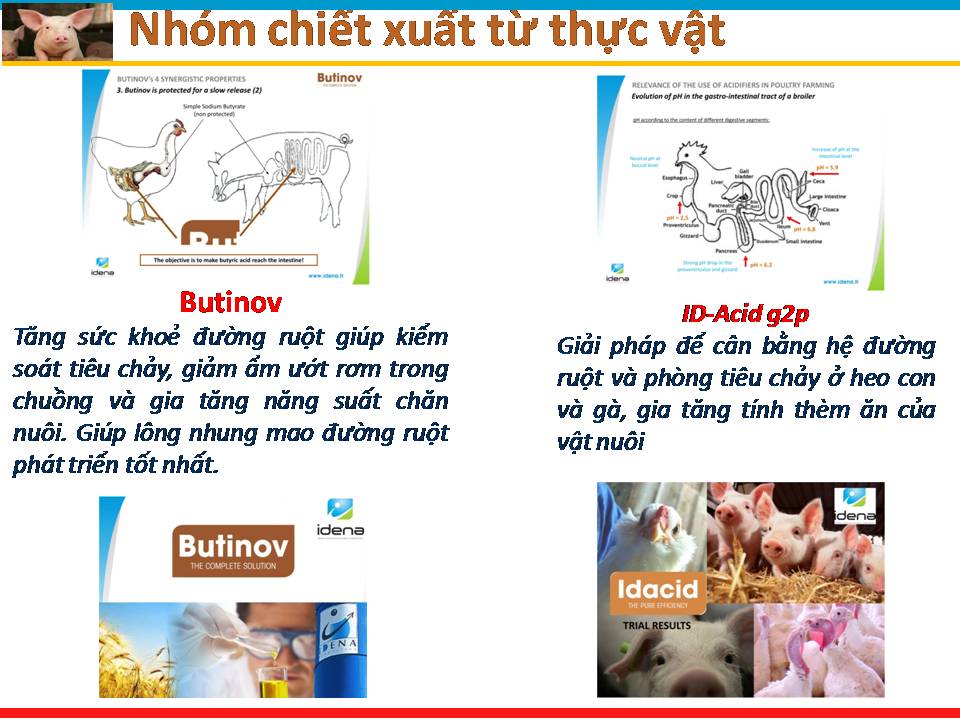 4. Butinov: Tăng sức khoẻ đường ruột giúp kiểm soát tiêu chảy, giảm ẩm ướt rơm trong chuồng, gia tăng năng suất chăn nuôi. Giúp lông nhung mao đường ruột phát triển tốt nhất.