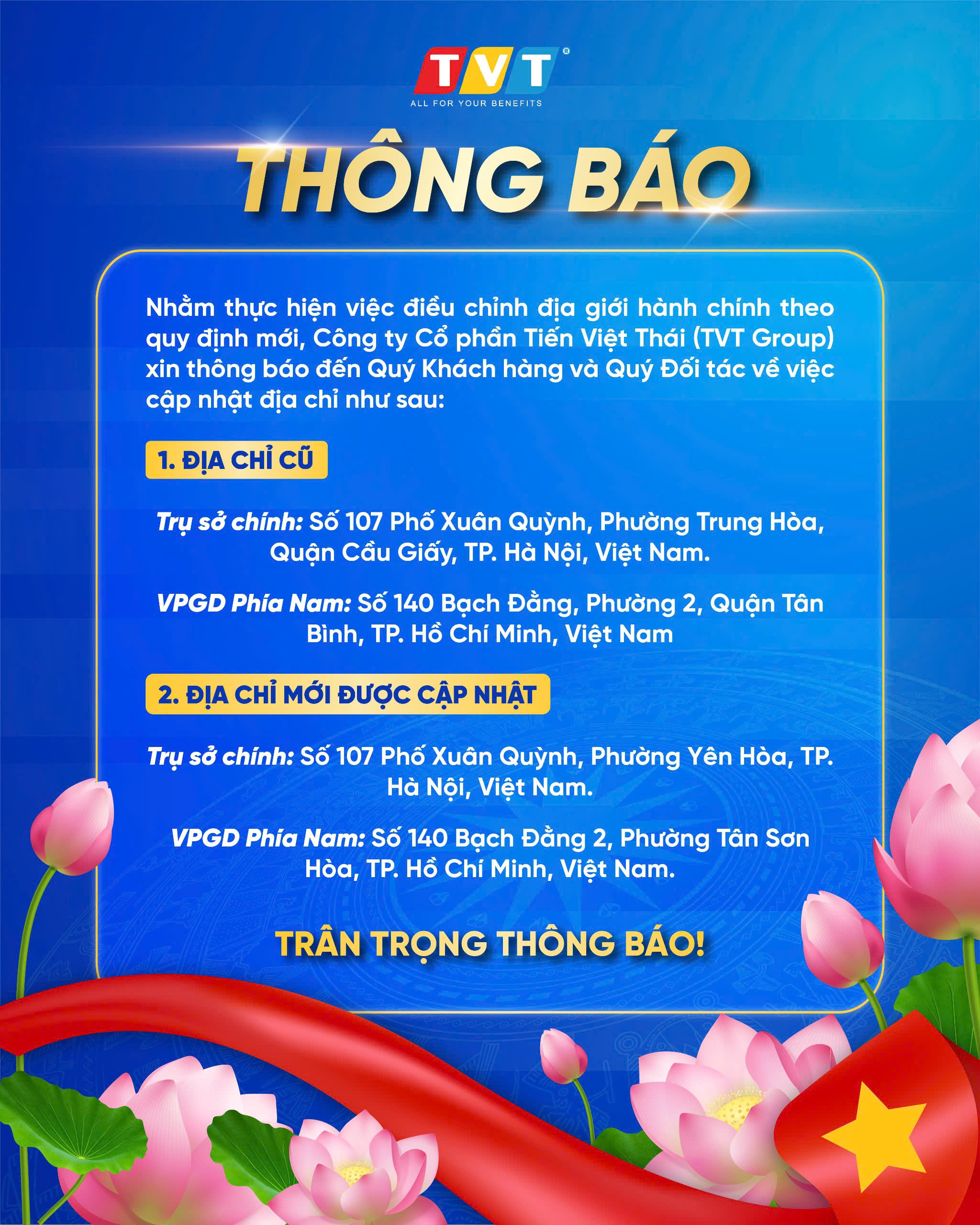 Căn cứ vào quyết định của cơ quan có thẩm quyền về việc sáp nhập địa giới hành chính , Công ty Cổ phần Tiến Việt Thái xin trân trọng thông báo đến Quý Khách hàng và Quý Đối tác về việc cập nhật địa chỉ trụ sở như sau: