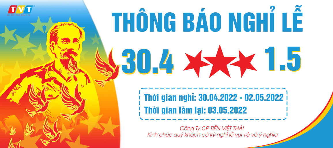 Nhân dịp kỷ niệm ngày giải phóng miền Nam, thống nhất đất nước (30/04/1975 – 30/04/2022) và kỷ niệm ngày Quốc tế lao động (01/05/1886 – 01/05/2022), Công ty Cổ phần Tiến Việt Thái xin chân thành cảm ơn Quý khách hàng, Quý đối tác đã tin tưởng, lựa chọn sản phẩm và dịch vụ của chúng tôi trong suốt thời gian qua.