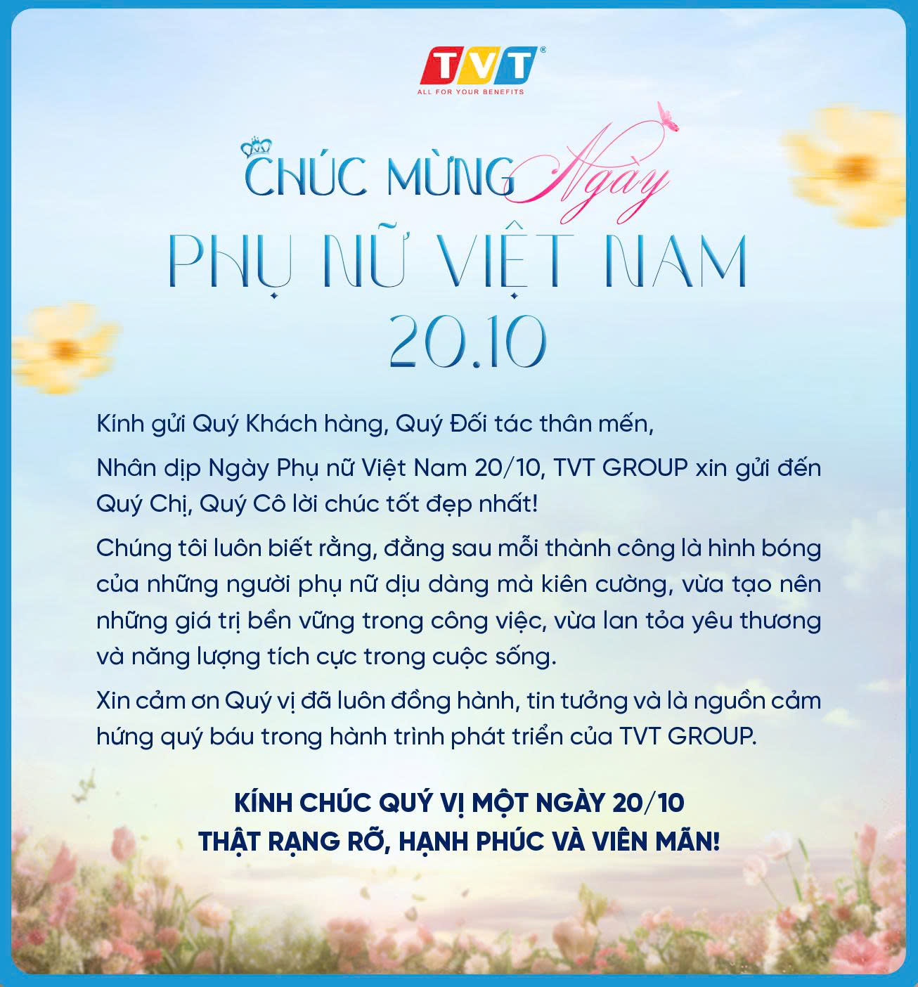 Nhân Ngày Phụ nữ Việt Nam 20/10, TVT Group xin gửi đến Quý Khách hàng và Đối tác nữ lời chúc trân trọng và sâu sắc nhất.